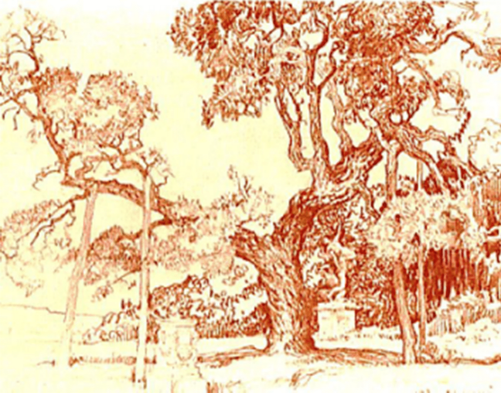 The Roman Altar depicted on the Great Lawn next to a statue of the Abduction of a Sabine Woman. ‘Altar and Cork Treesketched in 1950 by Sir William Russell Flint.