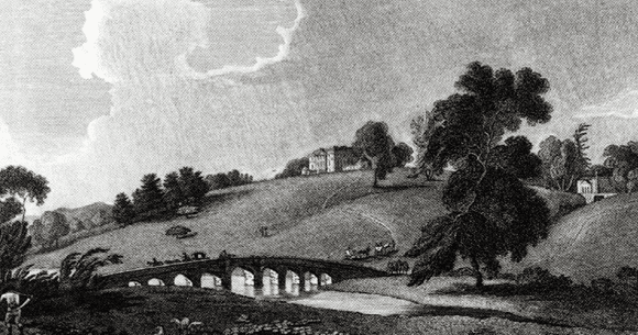 ‘House, Bridge and the River Mole’ by Harrison & Co, 1787. Depicts Hopkins’ grand Painshill House at the top of the hill and Hamilton’s smaller house on the far right.